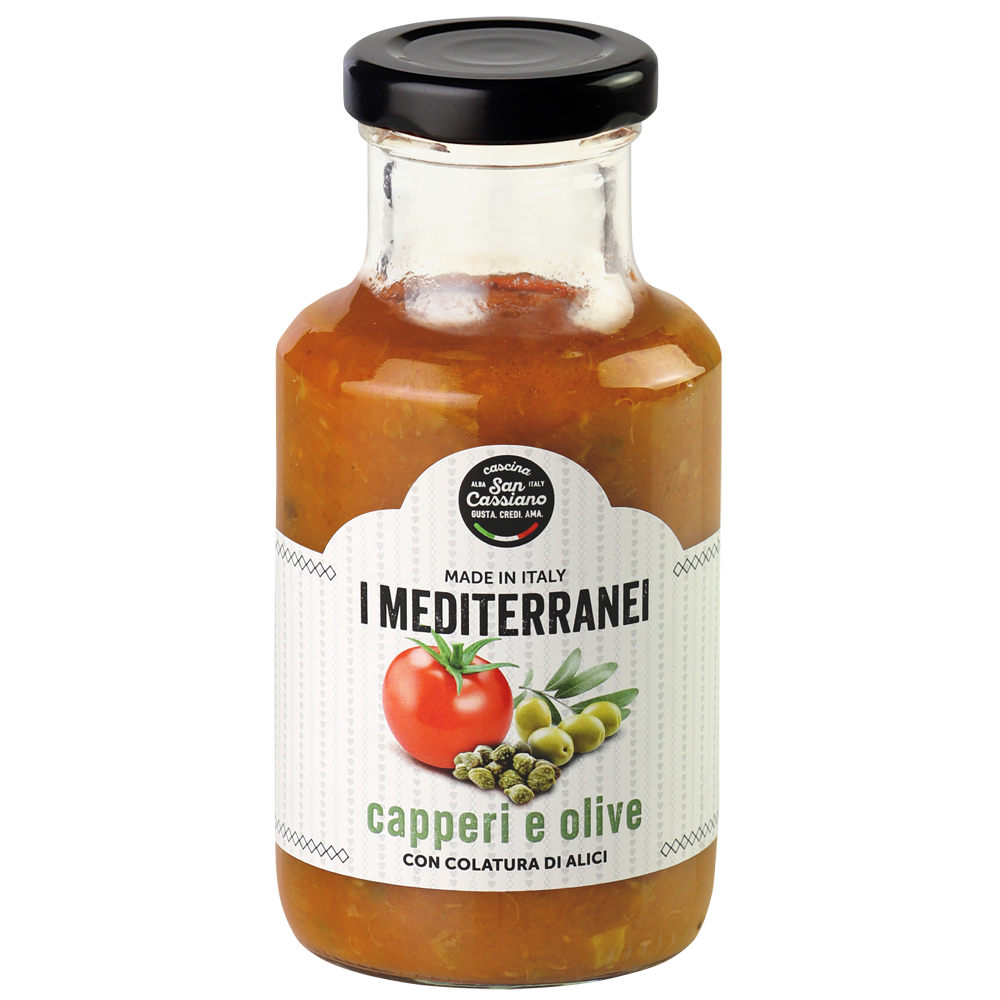 Typical sauce with a Mediterranean flavor, prepared with 100% Italian tomato, enriched with capers, olives and the renowned anchovies dripping. This traditional sauce with intense flavor is ready for seasoning pasta dishes, to flavor potatoes, fish and seafood salads.
