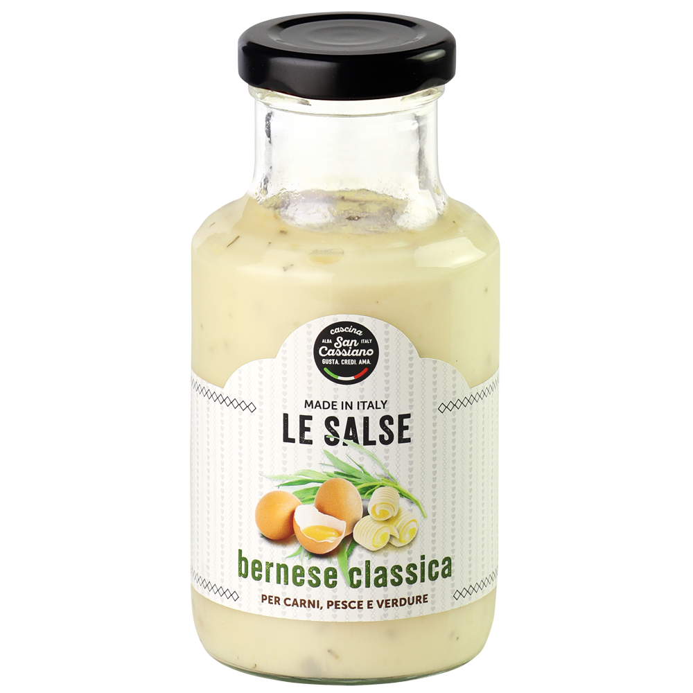 Béarnaise sauce is prepared with Italian fresh butter, egg yolk, chopped tarragon and white wine vinegar. It is a very delicate and creamy sauce suitable for seasoning vegetables; often served as an accompaniment to meat dishes such as steak, pork, or chicken.