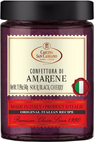 Jam prepared with sour black cherries and sugar. To spread on bread, to garnish cakes, with white yogurt or to pair with ricotta cheese or mascarpone. It goes very well on toasted buttered bread.