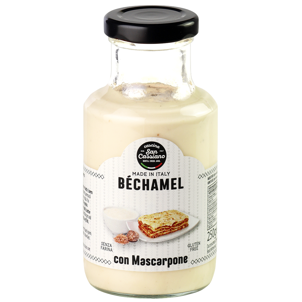 Salsa Béchamel preparata con Mascarpone e burro, aromatizzata con noce moscata e senza uso di farina. Questa béchamel ha una struttura vellutata e un gusto delicato, che rendono la salsa perfetta per condire lasagne, gratinare sformati di verdure e timballi di pasta o riso.