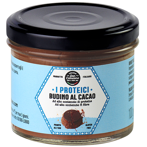 Goloso budino al cacao ad alto contenuto di proteine e fibre, gluten free. Perfetto per gli sportivi e per chi segue un particolare regime dietetico. Pronto da mangiare, si conserva fuori frigo fino all’apertura.