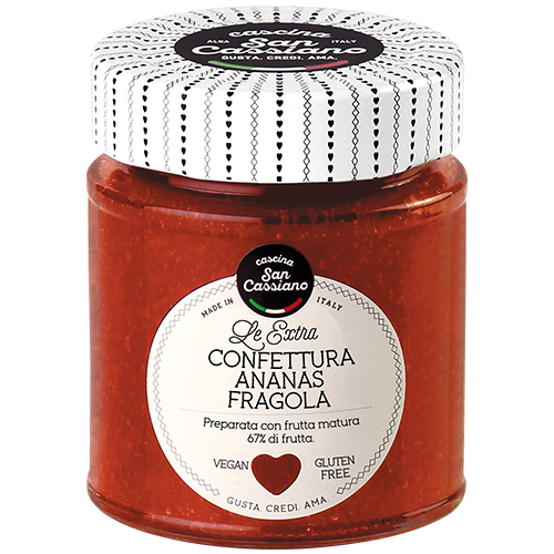 Confettura extra preparata con ananas, fragole e zucchero di canna. Ideale spalmata sul pane, per guarnire torte, yogurt e gelati.