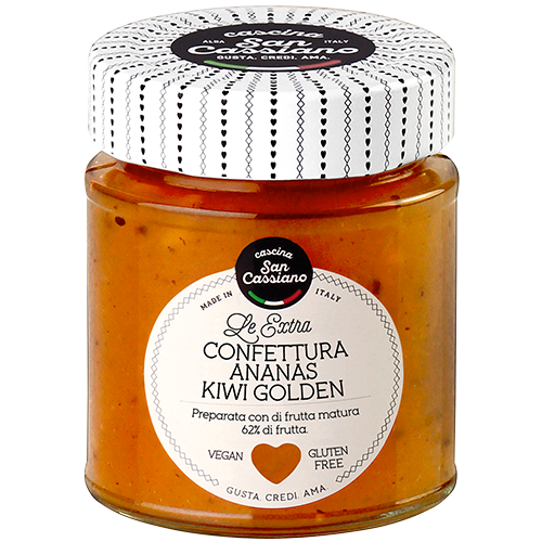 Confettura extra preparata con ananas, kiwi varietà “Golden” e zucchero di canna. Ideale spalmata sul pane, per guarnire torte, yogurt e gelati.