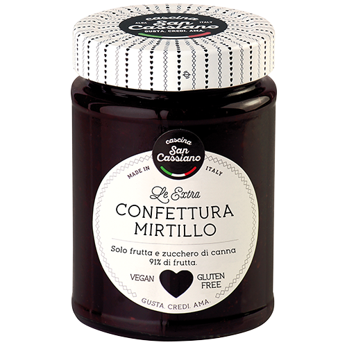 Confettura extra preparata con mirtilli e zucchero di canna. Ideale spalmata sul pane, per guarnire torte e yogurt. Ottima anche in abbinamento a secondi piatti a base di carni arrosto oppure con i formaggi.