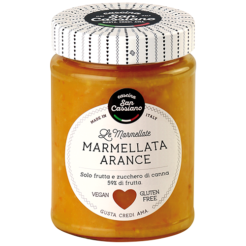 Marmellata preparata con arance e zucchero di canna. Compatta ma caratterizzata da un gusto delicato, quasi come un dessert. Ideale per farcire torte o guarnire gelati.