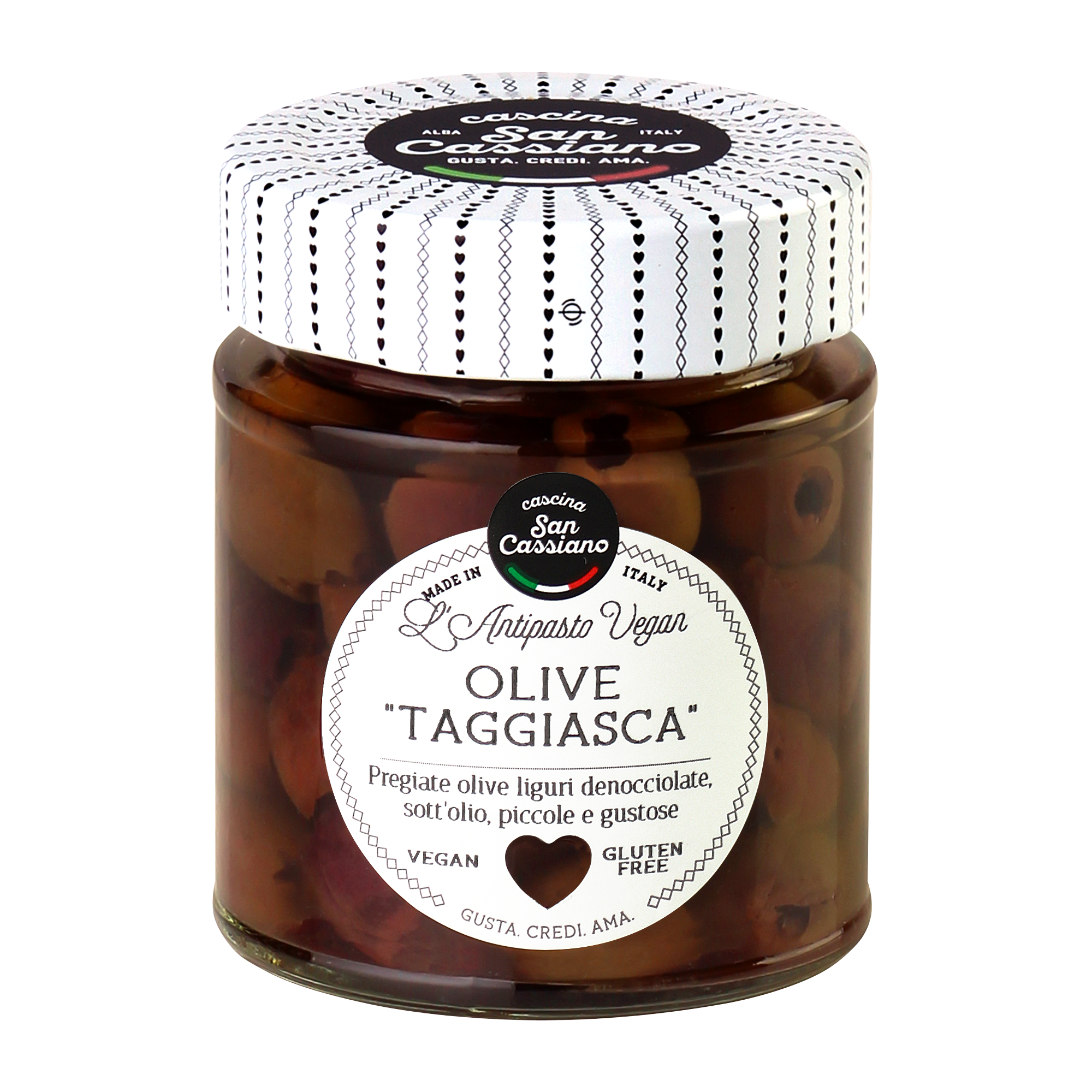 Olive varietà “Taggiasca” provenienti dalla Liguria, caratterizzate da dimensioni ridotte, colorito tendente al marrone e gusto molto intenso. Ideali per impreziosire salse per primi piatti a base di pasta o riso, in abbinamento a secondi piatti a base di carne o stuzzichini.