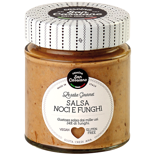 Preparata con noci e funghi. Ideale per condire primi piatti a base di pasta, in particolare gnocchi o pasta all’uovo, guarnire secondi piatti a base di carne. Ottima anche per preparare sfiziose tartine.