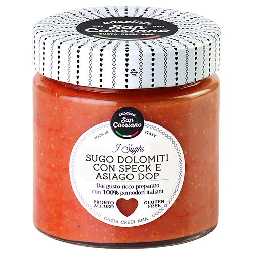 Sugo di pomodoro 100% italiano con formaggio Asiago D.O.P. e cubetti di Speck. E’ un sugo pronto dal gusto ricco che si presta alle più svariate fantasie culinarie.
