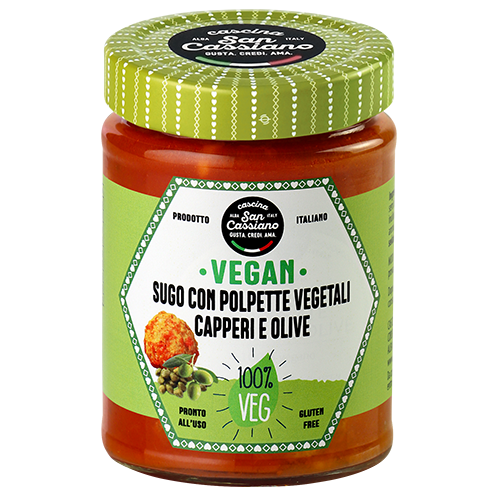 Sugo a base di pomodoro 100% italiano, capperi e olive con aggiunta di morbide e gustose polpette vegetali. Ottimo come condimento per la pasta, eccellente anche come secondo piatto.