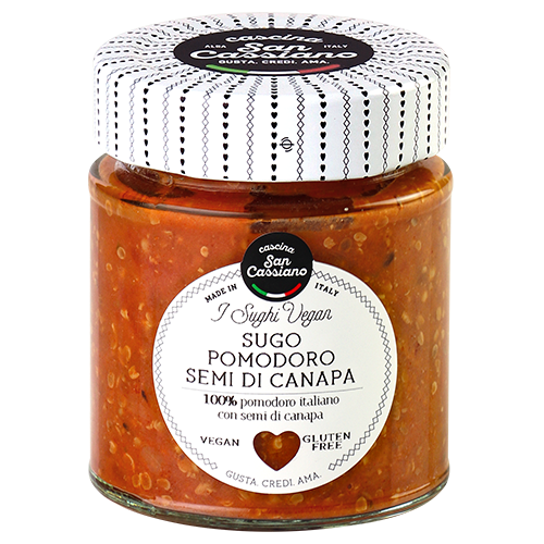 Intrigante sugo preparato con pomodoro e canapa: un alimento naturale i cui semi sono selezionati da sementi provenienti da piantagioni autorizzate di Canapa Sativa alimentare. I semi di canapa sono rinomati per via del loro particolare valore nutrizionale.